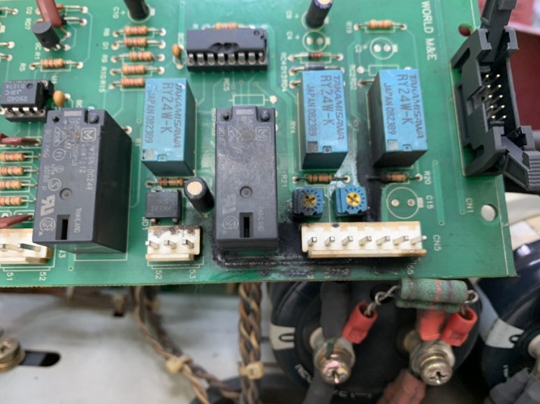 내부 청소후 보조PCB 릴레이부분 패턴이 열을 받아 검게 그을린 모습과 IC또한 파손을 확인 할수 있습니다. 이부분은 패턴을 이어주는 작업 보다는 추후 상황을 고려 하였을때 교환을 하는 방법이 최선이다는 판단으로 교환완료 하였습니다.