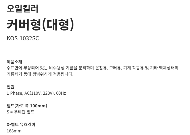 모델 KOS-1012SC KOS-1032SC KOS-1052SC KOS-1002SC X - 길이 111 168 235 265 □ - 벨트 재질 S=우레탄 벨트 오일 제거량 13.6ℓ/h 전원 (1Phase 110VAC, 220VAC 중 선택), 60Hz 적용가능 SEPARATOR OIL SEPARATOR (P, P2) -