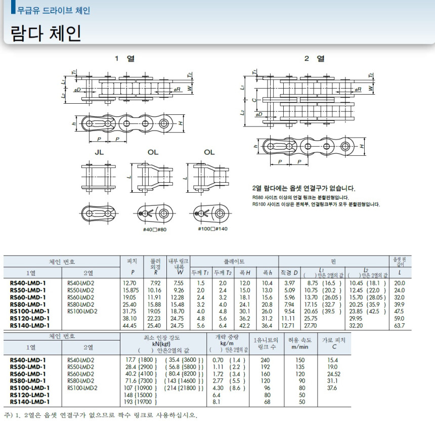 무급유 람다 체인 RS80-LMD는 쯔바키(TSUBAKI) 체인으로, 특수 처리된 부쉬(Bush)에 윤활유를 함유시켜 급유 없이 장기간 사용 가능하며, 기존 롤러 체인(RS 규격)과 호환되면서 마모 수명이 길어 식품 공업 등 급유가 어렵거나 불가능한 환경에 적합한 고성능 드라이브 체인입니다. RS80은 체인 규격(피치 25.4mm)을, LMD는 람다(Lambda) 무급유 타입을, '1'은 1열 체인을 의미하며, 식품 기계, 포장 기계 등 다양한 산업 분야에서 널리 사용됩니다