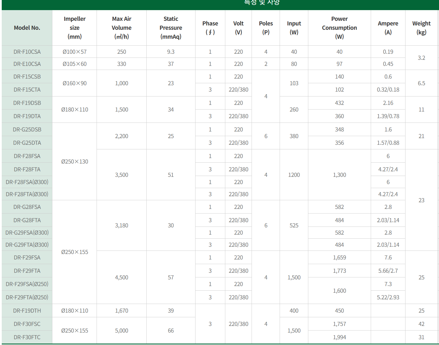 | 특징 | – 저소음형 팬 및 케이싱 설계로 소음 극소화 – 모터와 팬의 직결형으로 소형, 경량화하여 취급 및 설치 용이 – 설치한 상태로 모터와 팬의 분리가 가능하여 점검 및 보수 용이 – 각형 구조의 외형으로 시공성 향상 – 알루미늄 다이캐스팅 모터케이싱으로 모터의 열배출 극대화 ※ DR-G25DSA : 농업실용화재단 검정지도 |